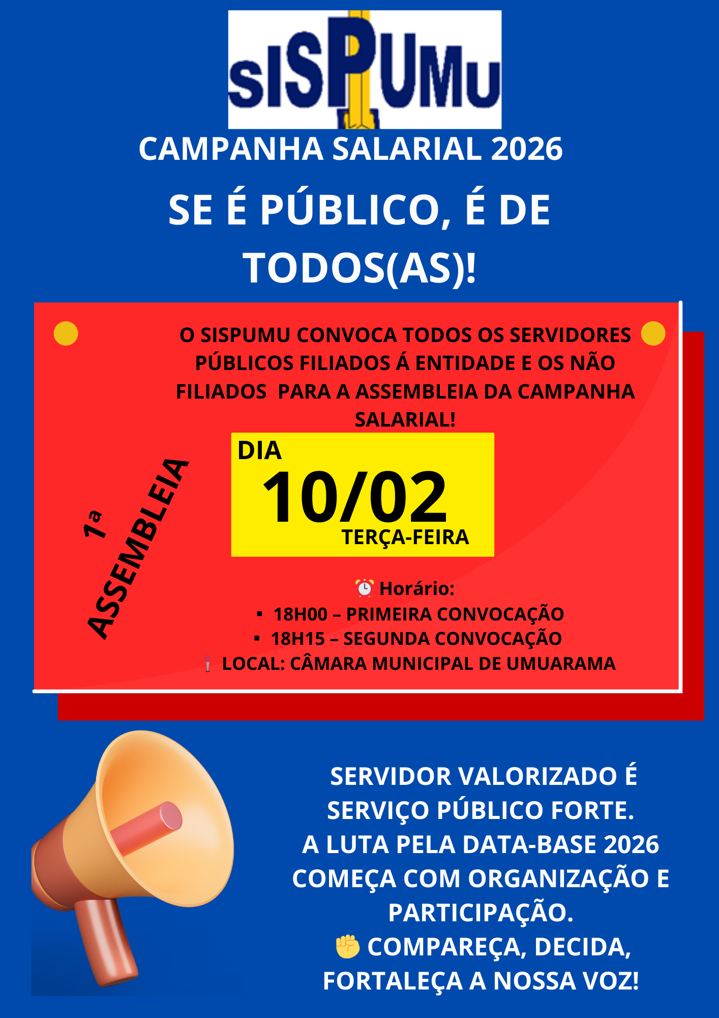 O SISPUMU – Sindicato dos Servidores Públicos Municipais, no uso das atribuições que lhe confere o Estatuto Social, convoca todos os servidores públicos municipais, filiados e não filiados, para participarem da Assembleia Geral Ordinária, a realizar-se no dia 10 de fevereiro de 2026, às 18h00, em primeira convocação, e às 18h15, em segunda convocação.